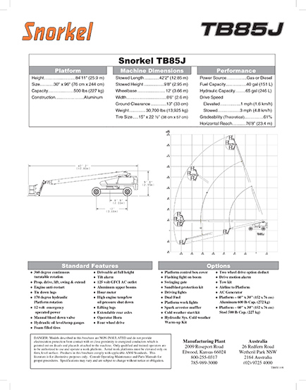 Thông số Kỹ thuật xe nâng người Snorkel TB85J: