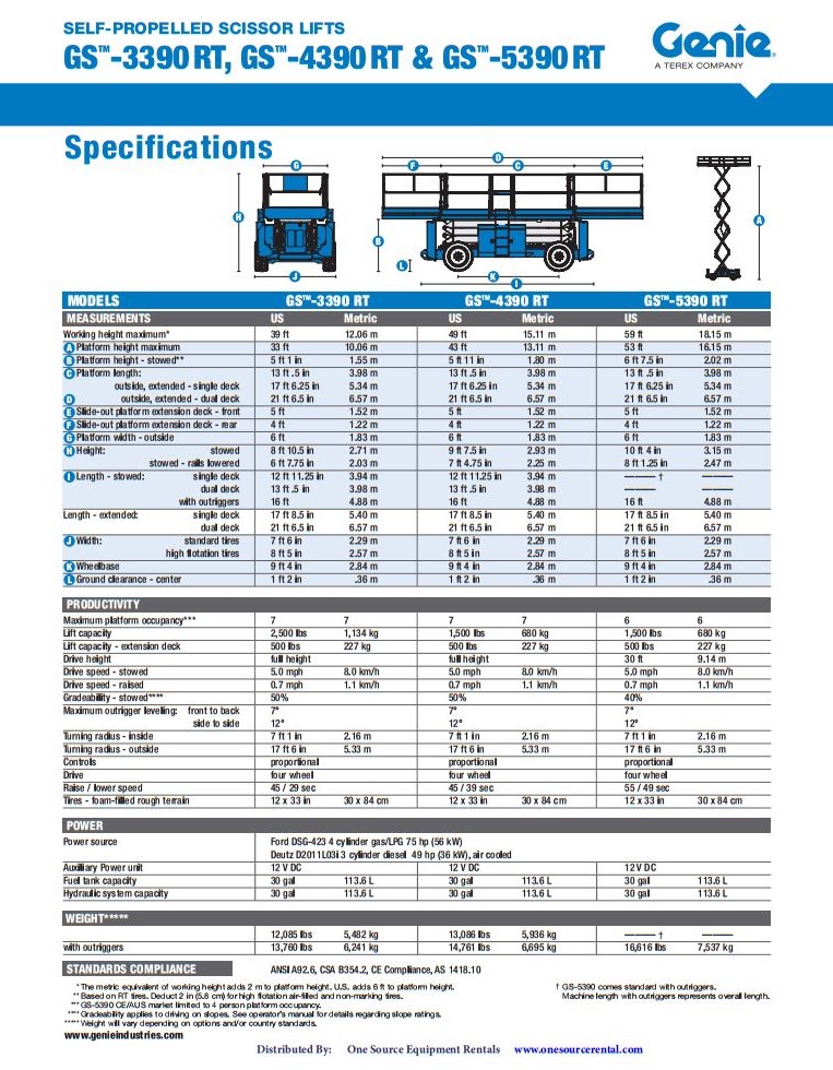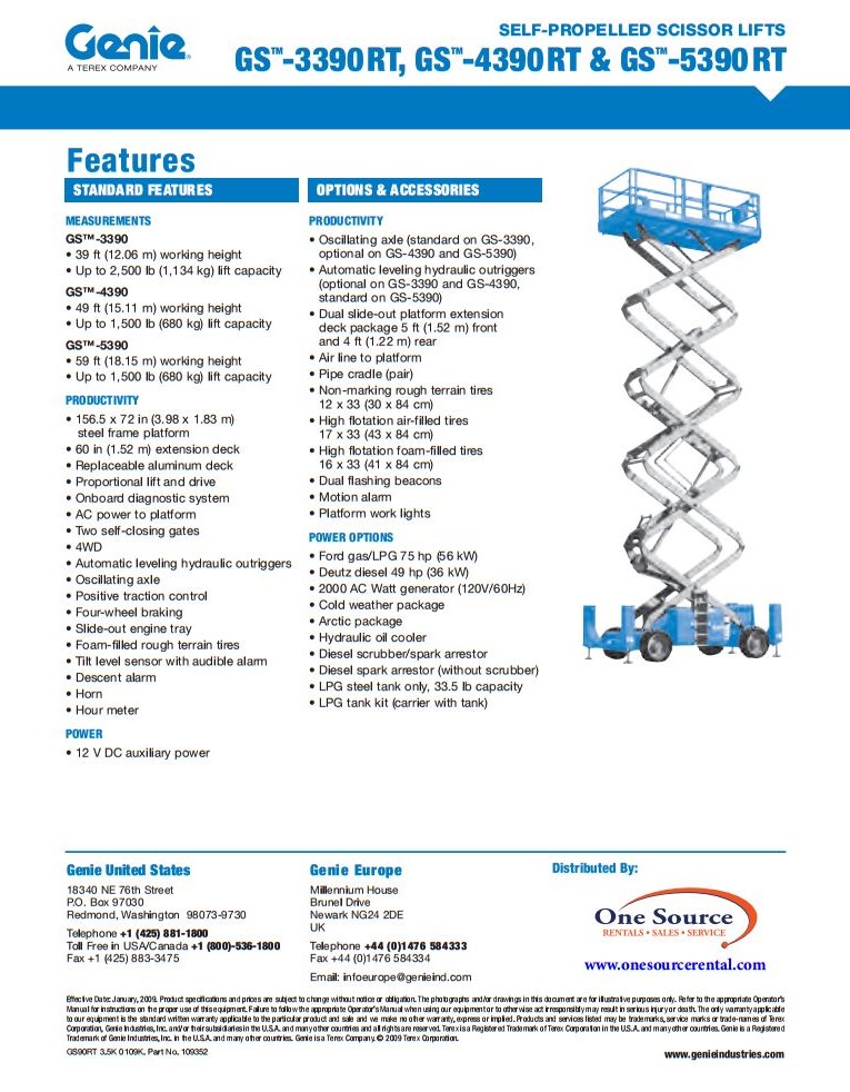 Xe nâng người Genie GS 5390 là model độ cao làm việc lớn nhất dòng xe cắt kéo của Genie. Xe chạy động cơ dầu D.O, sức nâng tối đa lên tới 680 Kg, sàn nâng có thể mở rộng mỗi bên 1.3m tạo không gian hoạt động rộng giúp đạt hiệu quả tối đa của công việc.