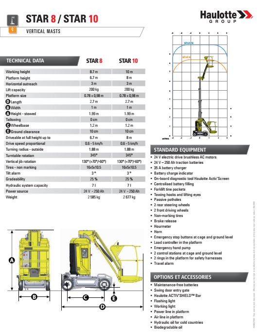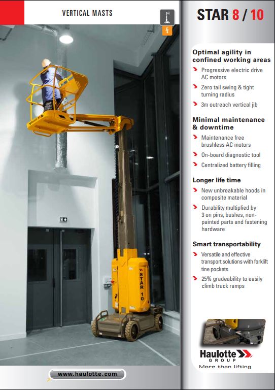 Haulotte Star 10 là dòng xe nâng người chạy điện nhỏ gọn, tầm với ngang 3m, rất phù hợp với các công việc bảo dưỡng, lắp đặt trong các nhà máy đã đi vào hoạt động sản xuất. Ngoài ra với kích thước nhỏ gọn xe có thể vào được thang máy nên có thể làm việc bảo dưỡng, trang trí trong các nhà hàng khách sạn, trung tâm thương mại. Xe chạy điện độ ồn cực thấp, không gây ôi nhiễm môi trường.